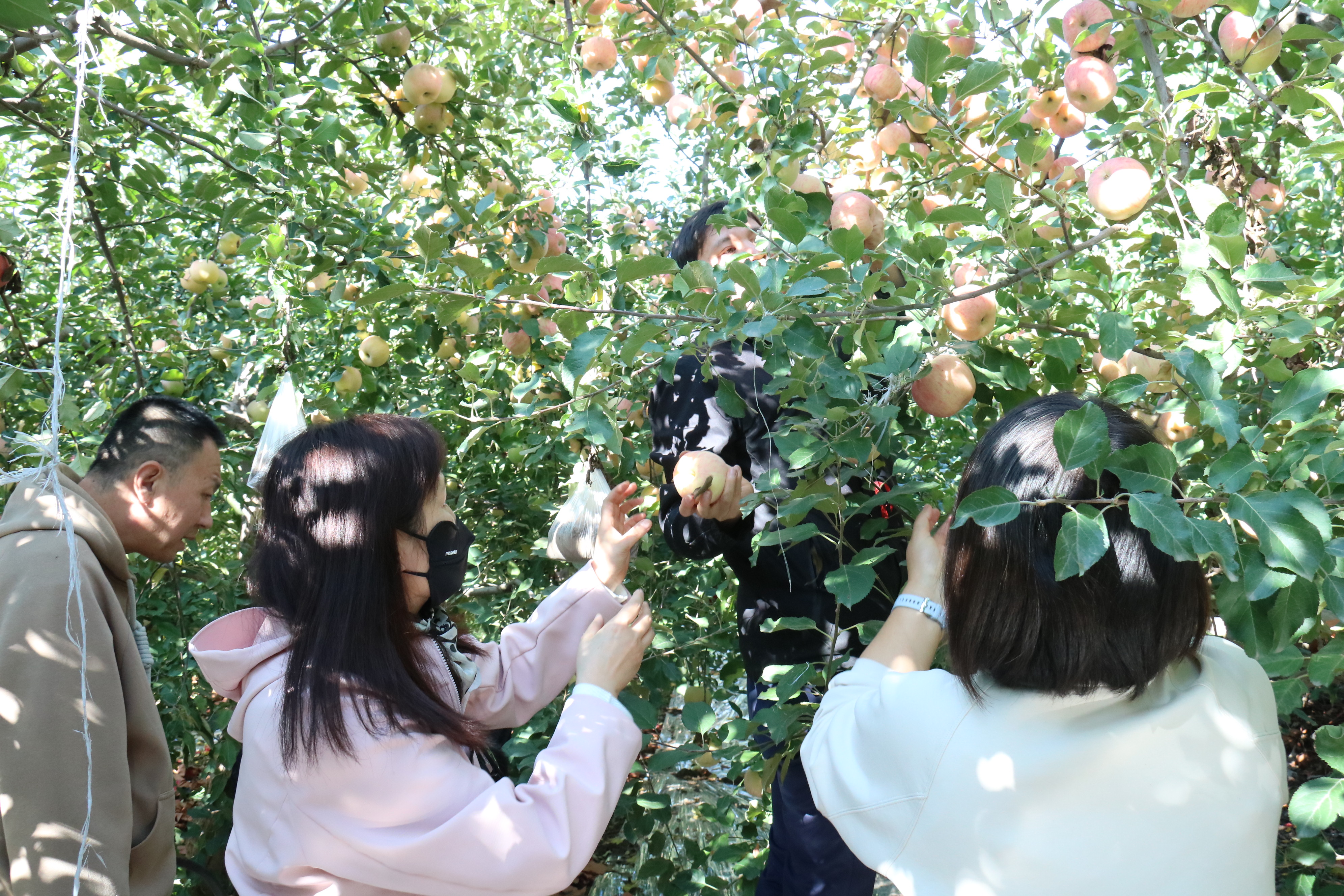 阳光洒向硕果累累的果园,红彤彤的苹果挂满枝头,色泽艳丽,诱人的果香在空气中弥漫,令人心旷神怡。大家手提果篮,兴致勃勃地开始了采摘。他们或弯腰仔细端详,或踮脚轻触枝头,精心挑选着每一颗中意的果实。果园里随处可见三五成群的教职工,他们一边熟练地采摘,一边分享着工作生活的点滴,欢声笑语与秋日的微风交织,回荡在丰收的果园里。许多老师表示,平日忙于工作,此次活动让他们得以暂时放下工作压力,亲近自然,放松身心,充分感受到了劳动的充实与丰收的喜悦。采摘过程中,同事们不仅交流采摘技巧,更互相帮助,协作采摘高处的果实,团结互助的氛围进一步增进了彼此的情谊。