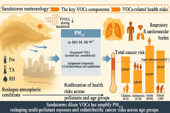 研究发现,沙尘天气虽然显著降低了总VOCs浓度,但PM2.5浓度明显升高,且健康风险并未同步下降;相反,高毒性的含氧挥发性有机物和卤代烃类物质在致癌和非致癌风险中占主导地位。研究还指出,气压是驱动沙尘天气下VOCs相关健康风险变化的关键气象因子。该成果突破了“沙尘天气仅仅降低空气污染”的传统认识,强调了极端天气下复合暴露风险与敏感人群差异化防护的重要性。